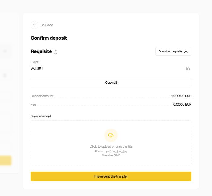 - Complete the bank transfer using the provided requisites.