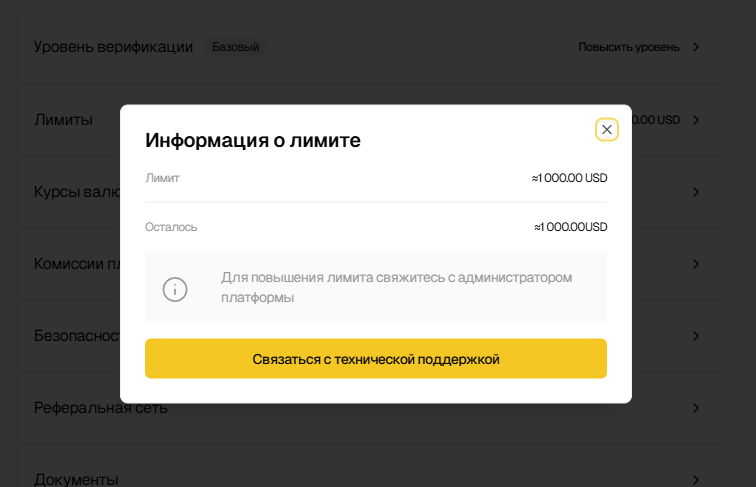 - Для повышения лимита необходимо связаться с администратором платформы и повысить свой уровень, предоставив дополнительные документы, подтверждающие источник средств